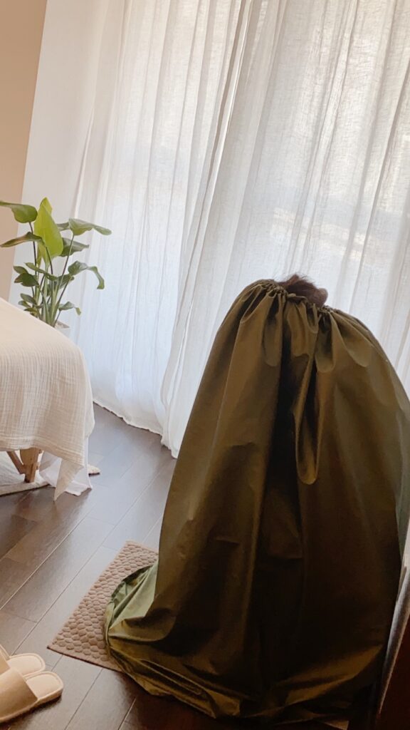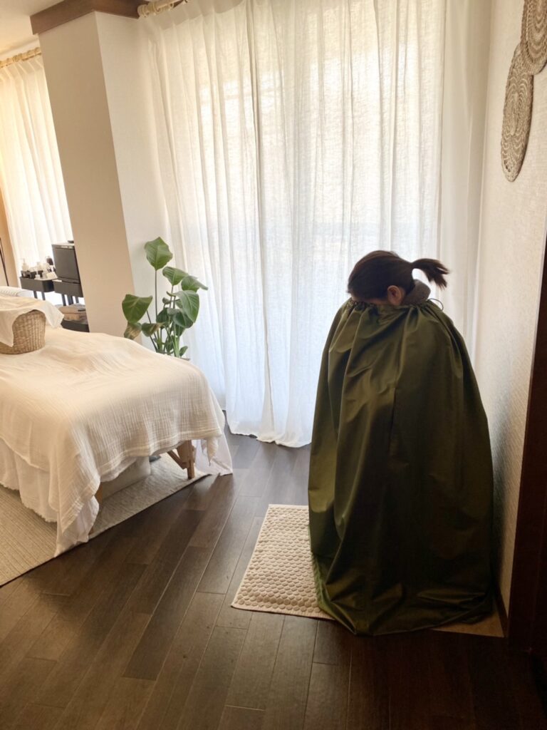 煮出したフレッシュな精油成分を、蒸気と共に粘膜やお肌、頭まで全身へ40分かけて浸透させていきます。ほどよい温かさで「気持ちいい~」とあっという間に過ぎる至福の時間。全く苦しくないのに、終わった後は身体の中から全身ぽかぽかに♡よもぎ蒸しで掻いた汗はサラサラで、天然の保湿成分になるのでお肌も全身しっとりすべすべに♡